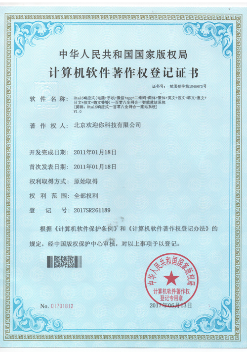 北京歡迎你科技有限公司獲得多項(xiàng)版權(quán)局"計(jì)算機(jī)軟件著作權(quán)登記證書",并已獲得“全國(guó)誠(chéng)信經(jīng)營(yíng)示范單位”、“全國(guó)質(zhì)量服務(wù)客戶滿意誠(chéng)信企業(yè)”和“全國(guó)重合同守信用品牌企業(yè)”等榮譽(yù)稱號(hào)。